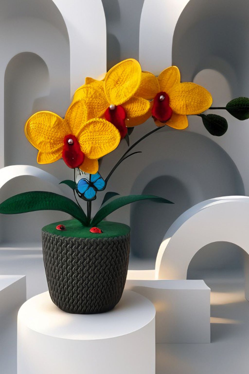 Orhideea galbena crosetata manual este alegerea perfecta pentru a aduce o nota de naturalete si frumusete in locuinta dumneavoastra. Fiecare detaliu este creat cu grija si pasiune, transformand acest aranjament floral intr-o opera de arta unica. Conferiti spatiului dumneavoastra un aer proaspat si sofisticat cu aceasta minunata orhidee crosetata manual!